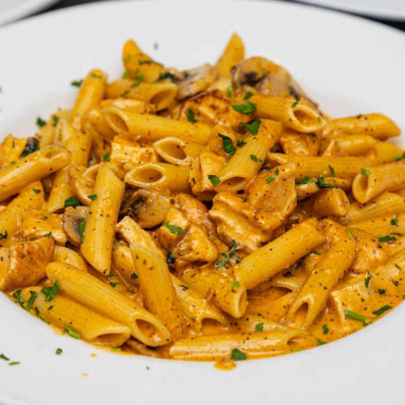 Penne pasta tossed in a light pink vodka cream sauce