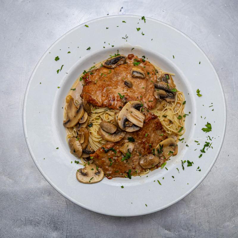 Served in a rich marsala wine and mushroom sauce